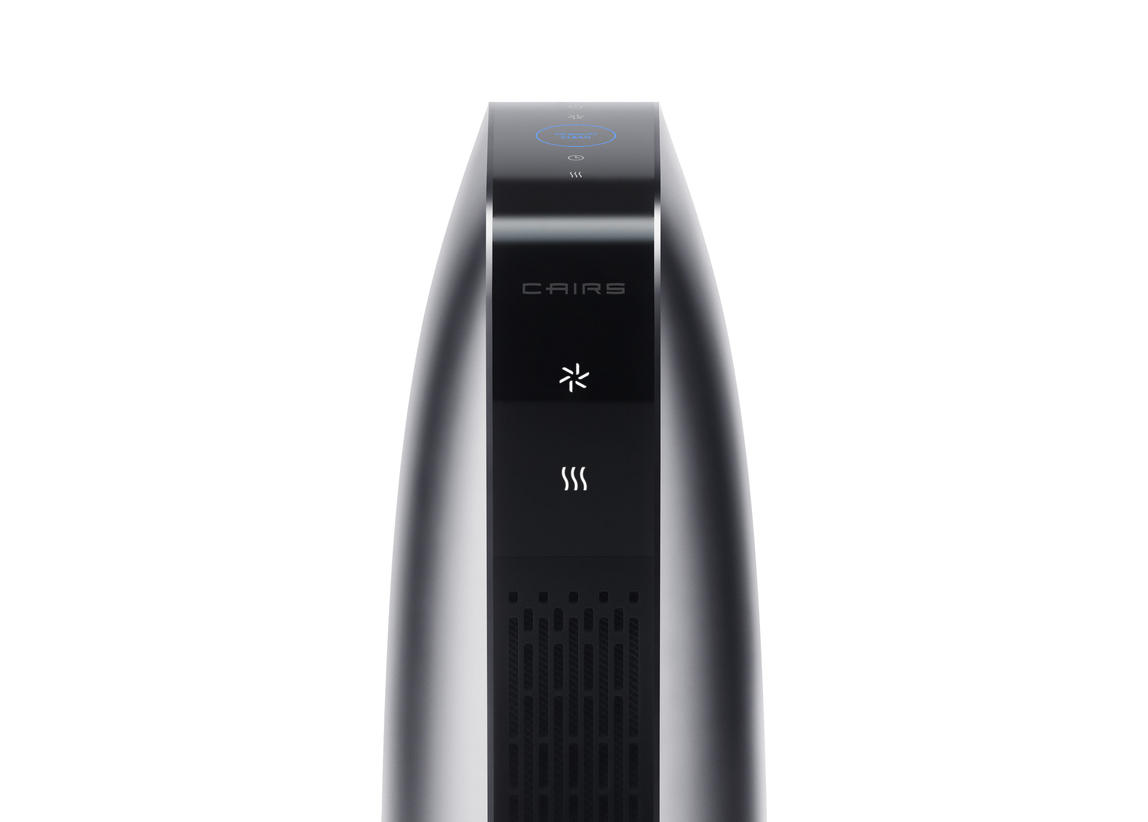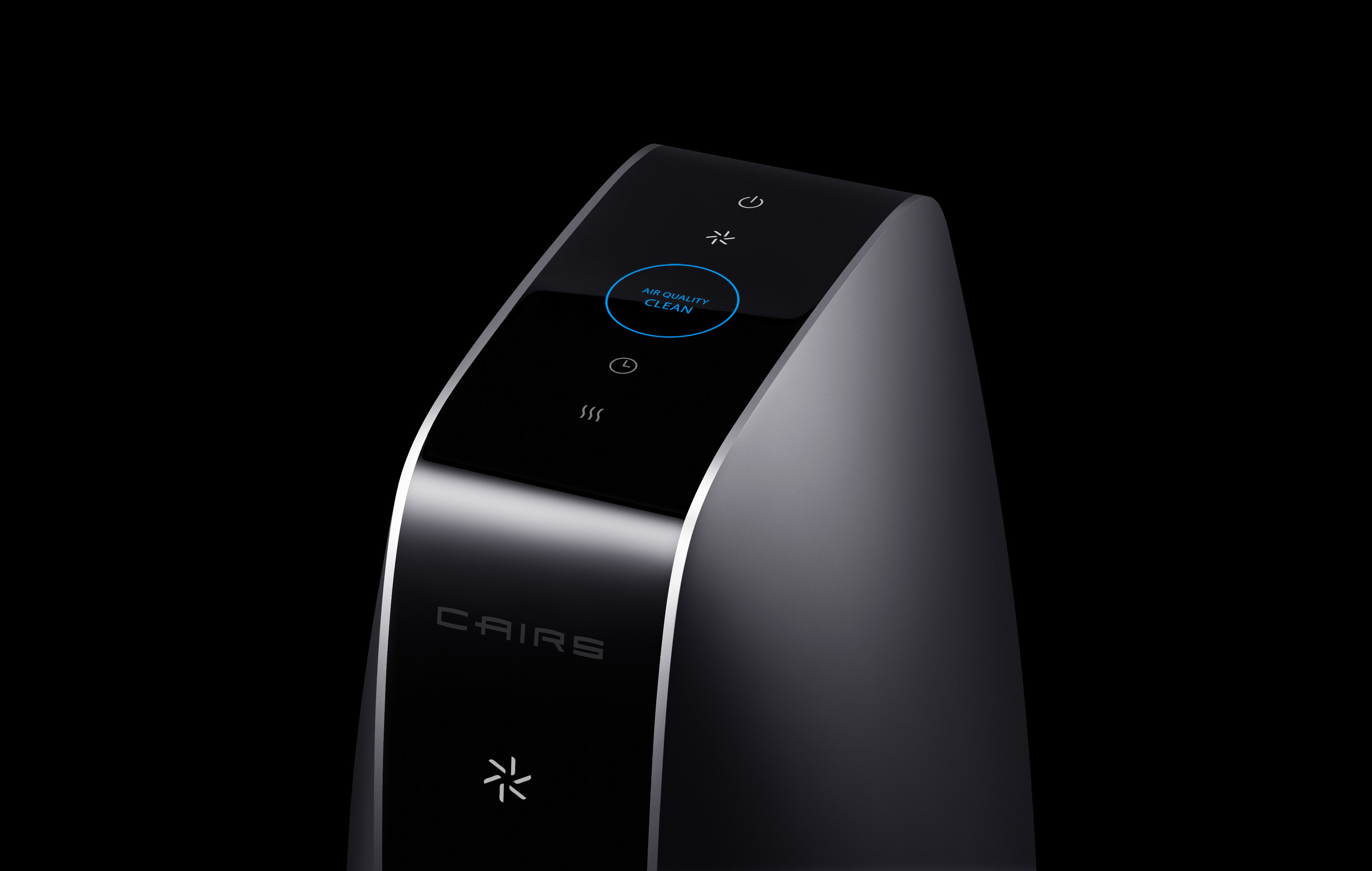 The particle sensor in the back grille measures air quality, while the circular lighting on the top visually indicates the air quality through color. When the air is clean and pure, the word "CLEAN" appears within a blue circle on the top.