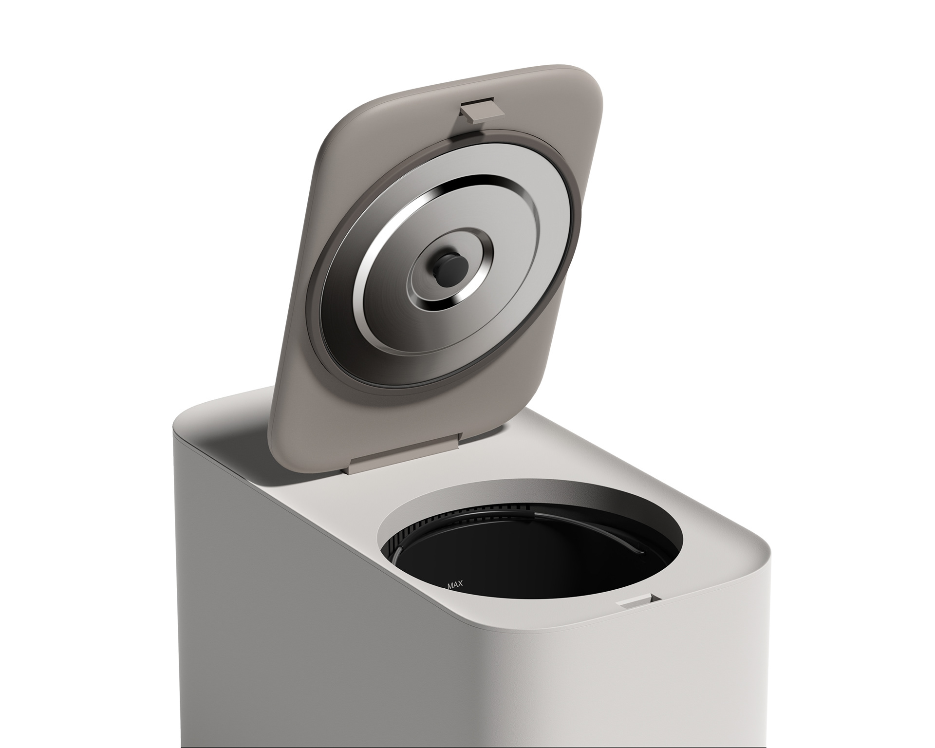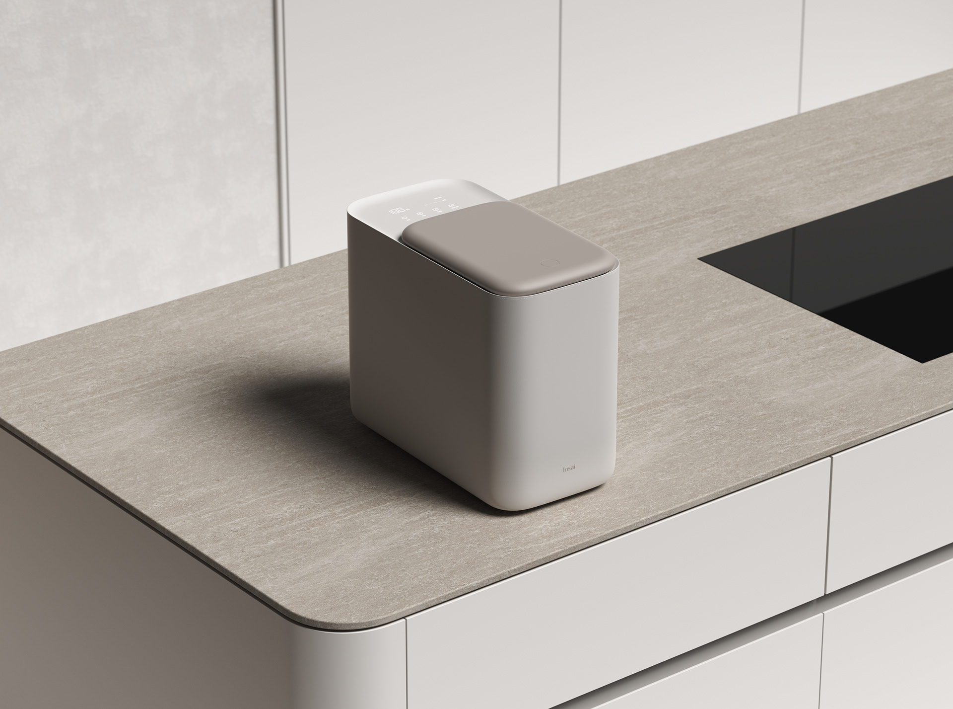 VLND designed a food waste disposer for Insai that processes food waste into a dry powder. Its minimalist form, resembling a smooth stone resting on a plate, offers an aesthetically pleasing look. The intuitive and streamlined control panel ensures ease of use: users simply add the food waste, touch a button, and the process begins. It is designed to blend seamlessly into a minimalist kitchen, providing an understated and balanced presence that fits naturally into the home.